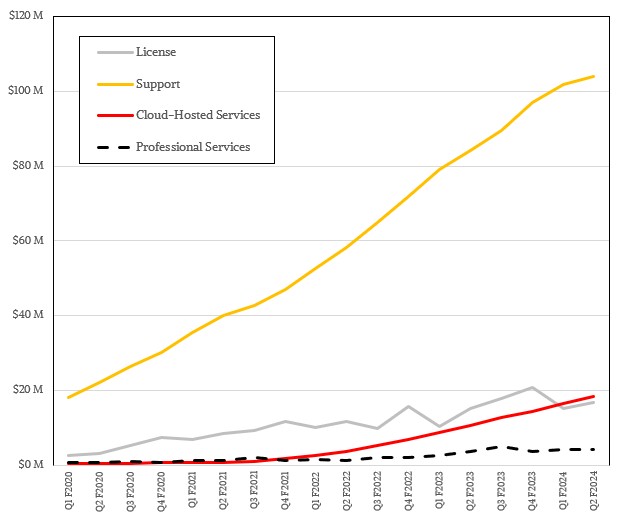 In the July quarter, software license sales only grew by 9 percent to $16.7 million, but support sales rose by 23.4 percent to $104 million. Cloud-hosted services – meaning running parts of the Hashi Stack of infrastructure control tools on a cloud and having it managed by HashiCorp itself – rose by 73.3 percent to 18.4 percent.