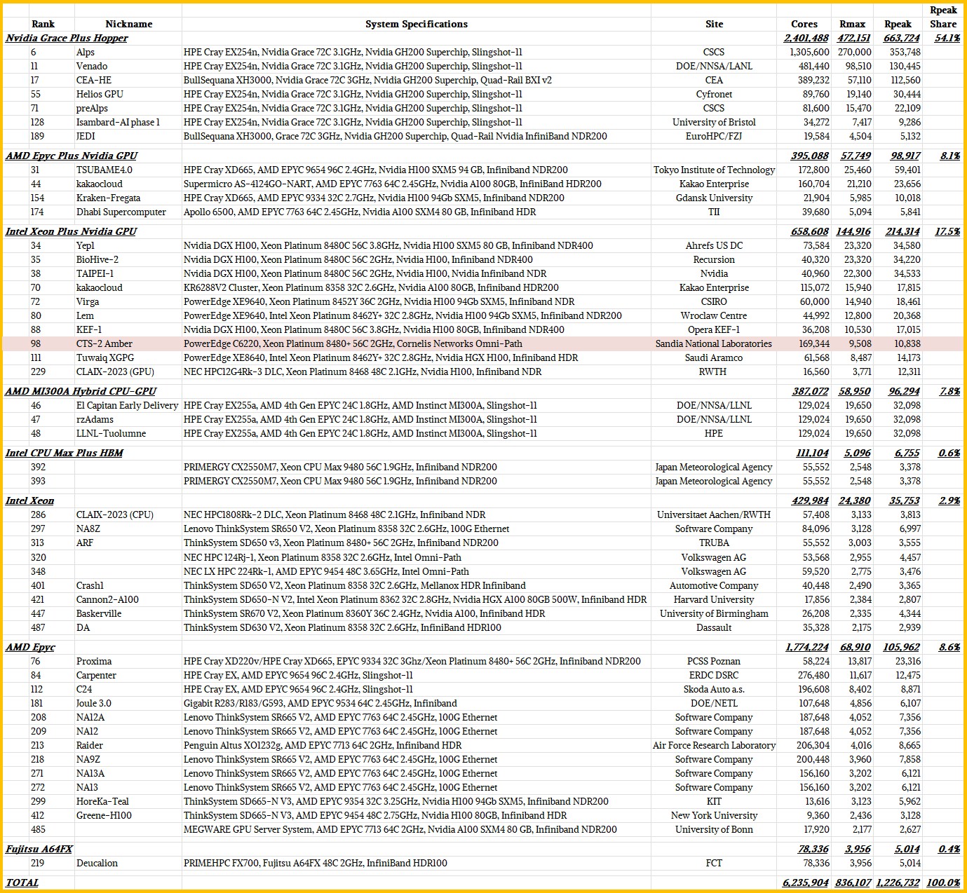 Nice categorization of the 49 new supers! I was slightly surprised that GH200 is ahead of MI300A in terms of “completeness of offerings” at this stage, but digging through paleontological TNP archives it seems that Grace-Hopper was announced in April 2021, and MI300A only a year later in June 2022 … and so it actually makes sense that the new-tech Alps and Venado are currently more ready than the new-tech El Capitan (Grace-Hopper: https://www.nextplatform.com/2021/04/12/nvidia-enters-the-arms-race-with-homegrown-grace-cpus/ , MI300A: https://www.nextplatform.com/2022/06/14/chip-roadmaps-unfold-crisscrossing-and-interconnecting-at-amd/ ).