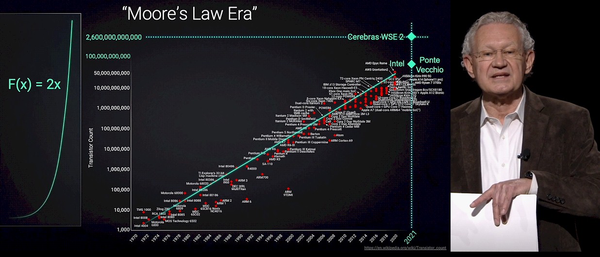 Here is de Geus showing the well familiar exponential plot of the transistor density of CPUs, starting with the Intel 4004 in 1971 and running all the way out five decades later to the Intel “Ponte Vecchio” GPU complex, with 47 chiplets lashing together 100 billion transistors, and the Cerebras WSE 2 wafer-scale processor, with 2.5 trillion transistors.