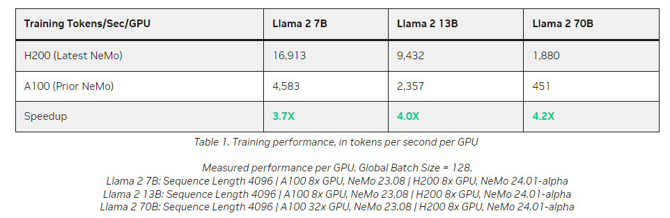 The 4.2X is achieved using supervised tuning, which is a harder way to do things but gets a more accurate model. The thing to note is how even on the Llama models of varying sizes (the same architecture is run with different hyperparameter counts between 7-70B) Nvidia is able to maintain throughput per GPU for the most part.