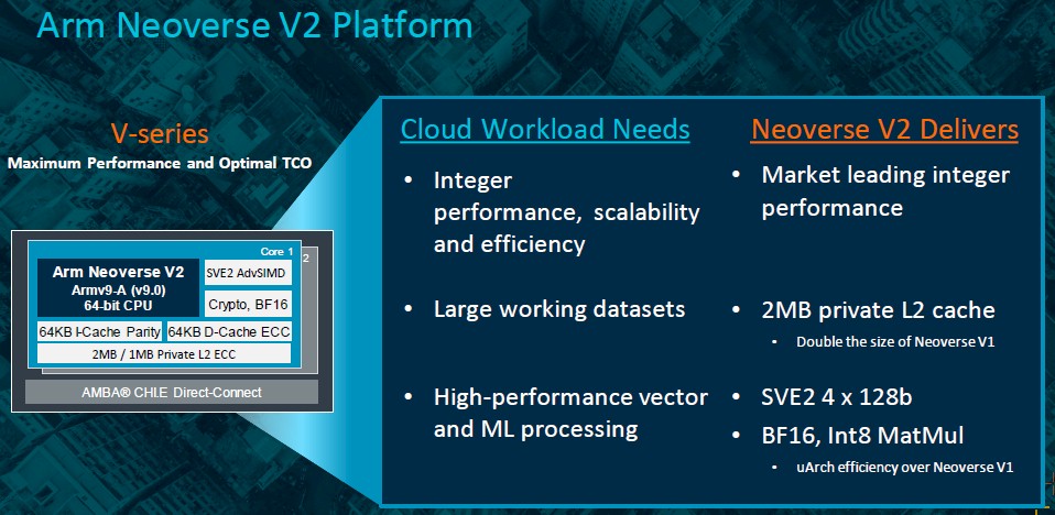 The Demeter V2 core is paired with DDR5 memory and PCI-Express 5.0 peripheral controllers and will support the CXL 2.0 coherent memory protocol for accelerators, which allows for memory pooling across servers as well. The V2 core definitely supports the Armv9-A architecture previewed in March 2021, which among other things supports the second generation Scalable Vector Extension (SVE2) vector math design, which has a quad of 128-bit vectors lashed together that supports INT8 and BF16 formations as well as the usual single precision FP32 and double precision FP64 floating point math.
