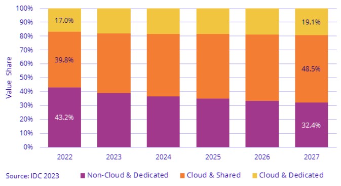 While the statement put out by IDC doesn’t give the full spending number for datacenter servers and storage for 2023, we did the math on what it put out in the table above and will tell you. Overall spending worldwide is expected to decline by nine-tenths of a point to $153.5 billion. And all of that decline is going to be due to a forecasted 10.9 percent decline in spending for on-premises, non-cloud gear. Spending on cloud capacity, whether it is running in one of the big clouds or regional or niche service providers, is expected to grow by 6.9 percent to $93.7 billion. That sounds good, but it is a far cry from the 19.4 percent growth in shared and dedicated cloud spending. Shared cloud capacity – what many call public cloud but we have not for years because Amazon Web Services, Microsoft Azure, and Google Cloud are not public utilities, but private enterprises – is expected to bring in $66.1 billion in 2023, up 7.5 percent from 2025’s spending levels. Dedicated cloud – which can mean outposts of the big clouds that run on co-location facilities or corporate datacenters – is expected to grow modestly, up 5.4 percent, this year to $27.6 billion in sales.
