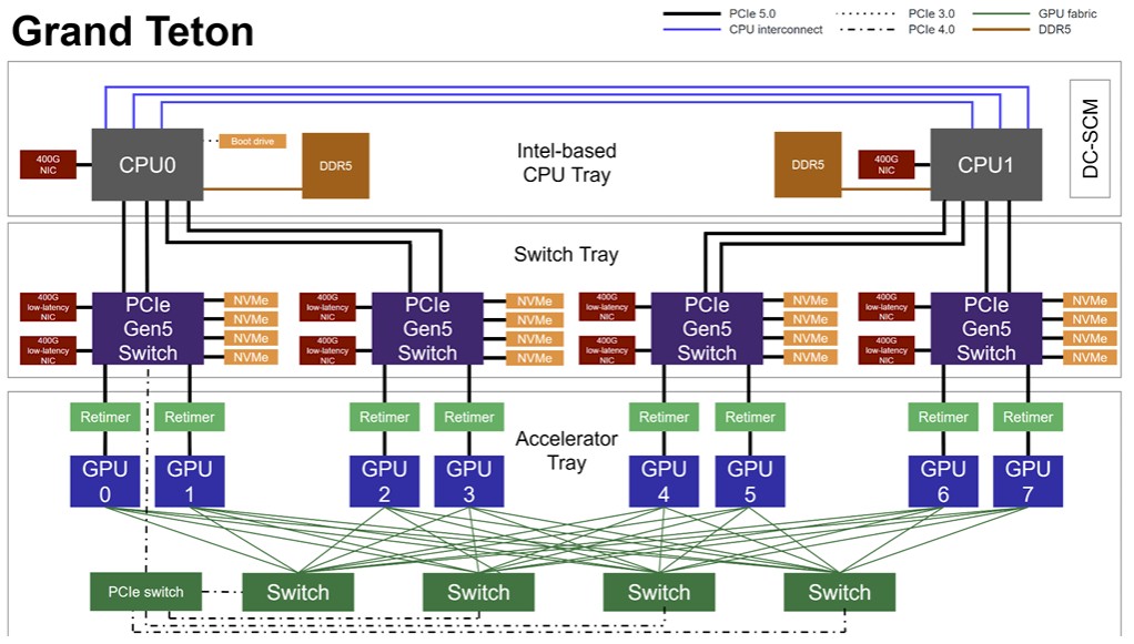 Here is a different – and perhaps more accurate – block diagram that shows how the switches and retimers are used in the Grand Teton system, which comes from its OCP specs: