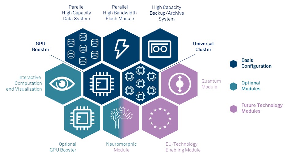 The Universal Cluster at the heart of the system is the one based on the SiPearl Rhea1 CPUs, which is also known as the Cluster Module in the EuroHPC presentations. No details were given about what Nvidia technology would be deployed in the Booster Module. We walked through the possible scenarios to get to 1 exaflops in our June 2022 coverage, and just for the heck of it we are going to guess that EuroHPC will make the right price/performance and the right thermal choice and employ the PCI-Express versions of the “Hopper” H100 GPUs – not the SXM5 versions on the HGX motherboards that have NVSwitch interconnects to provide NUMA memory sharing across the GPUs inside of a server node.
