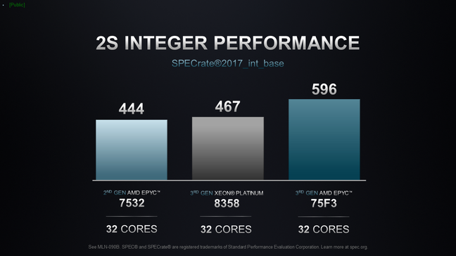 The “Ice Lake” core has a tiny bit more oomph than the Epyc 7002 core it was intended to compete against, but Intel didn’t make it into the field in time to do that, and the Epyc 7003 core, based on the “Zen 3” design, has quite a bit more performance. Therefore, a 32-core Epyc 7003 chip can do 34.2 percent more integer work and 30.6 percent more floating point work than the 32-core “Ice Lake” chip.